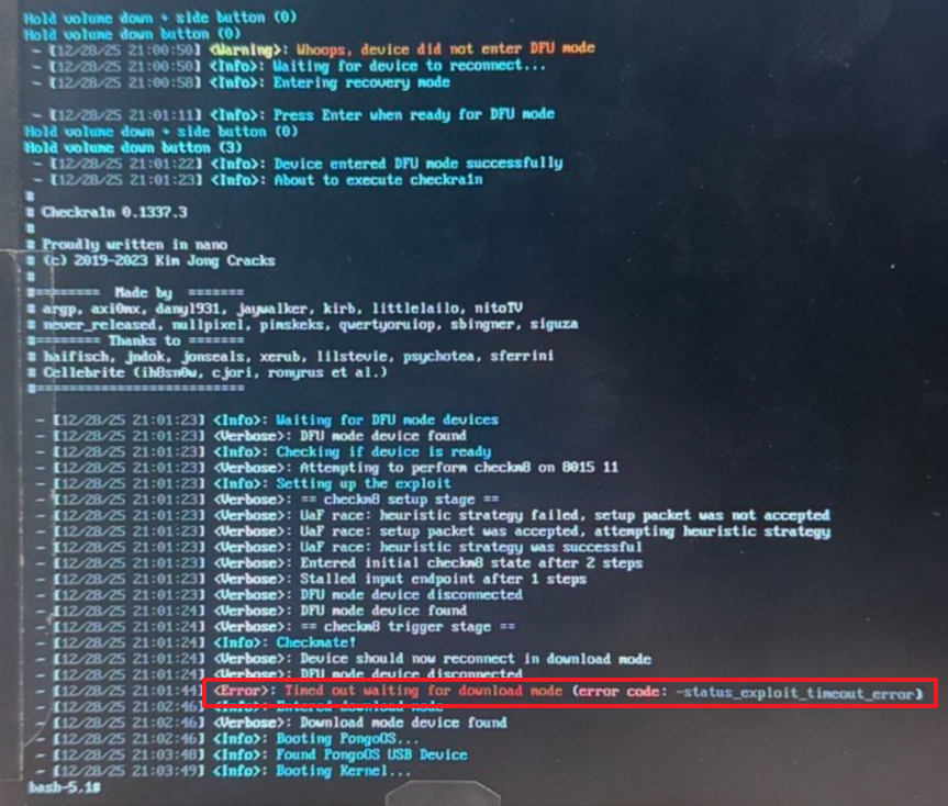<Error> : Timed out waiting for download mode (error code: -status_exploit_timeout_error)